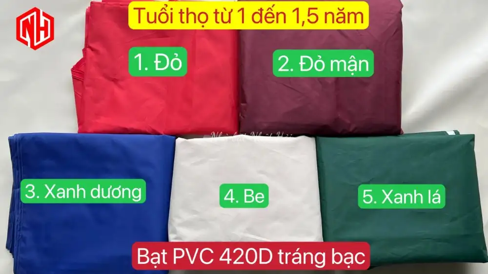 Bạt PVC 420D tráng bạc: Chống tia UV, màu xanh dương, đỏ, be, xanh lá, đỏ mận.